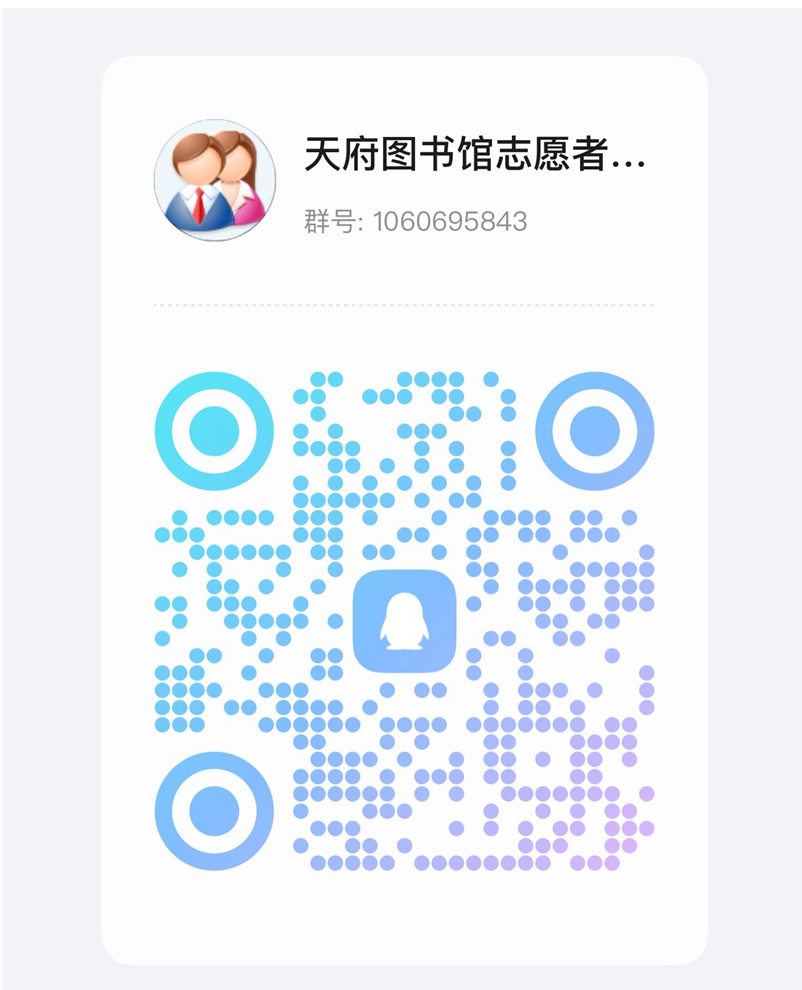 ① 扫码加入天府图书馆志愿者25级(绵阳)QQ群,群号是1060695843