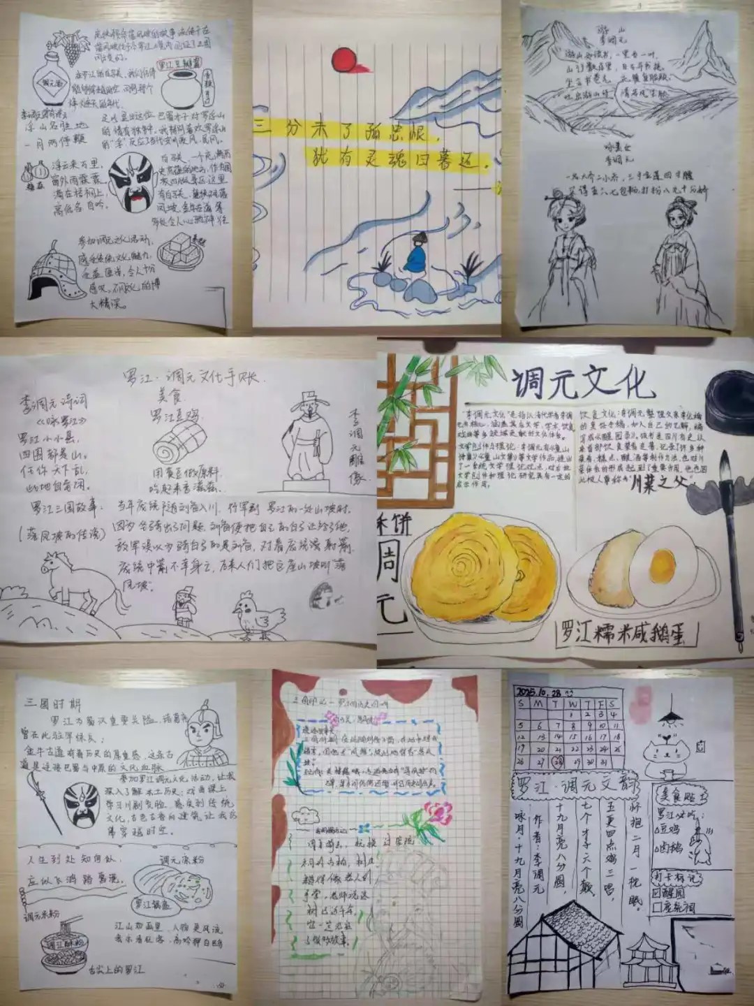 本次活动以手账为载体,鼓励学生深挖罗江文化魅力:可摘抄李调元经典诗词、记录三国传奇故事、绘制调元美食简笔画,或写下研学、戏曲课堂等文化活动感悟。创作无需额外成本,只需纸笔即可开启文化盛宴,参与师生巧用贴纸、彩笔、印章及AI工具尽情创意,让手账成为独一无二的文化艺术品,用创意和AI工具传承非遗。