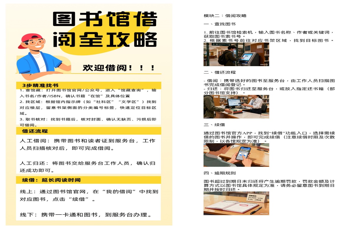 本次活动以线上签到、线上线下提交作品的形式开展。聚焦图书馆空间导览、借阅攻略、数字资源使用、服务清单、规则须知五大核心模块,鼓励参与者用图文、视频、新媒体作品、文创设计等多种形式创作。活动期间,师生们充分发挥创意,产出了漫画手册、趣味短视频、互动H5、桌游设计等一大批优质作品,既清晰传递了图书馆使用要点,又展现了丰富的想象力与创造力。