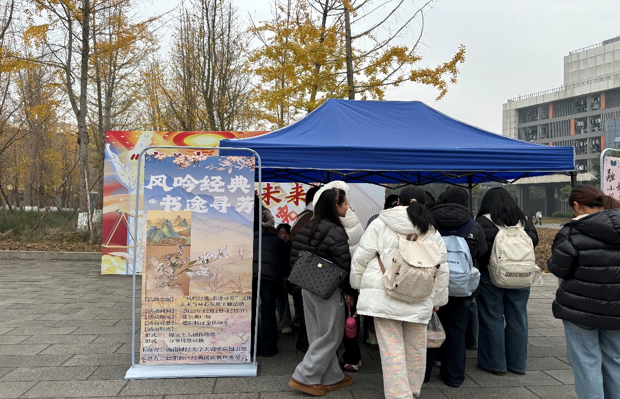12月1日至12月5日,由西南财经大学天府学院图书馆主办、德阳校区经典阅读管理委员会承办的“风吟经典·书途寻芳”文体艺术与身心发展主题活动在德阳校区顺利开展,本次活动旨在传承中华优秀传统文化、营造校园诗歌阅读与创作氛围,以诗歌为纽带,搭建起师生与经典对话、与心灵共鸣的文化平台,吸引了全校500余名师生参与。