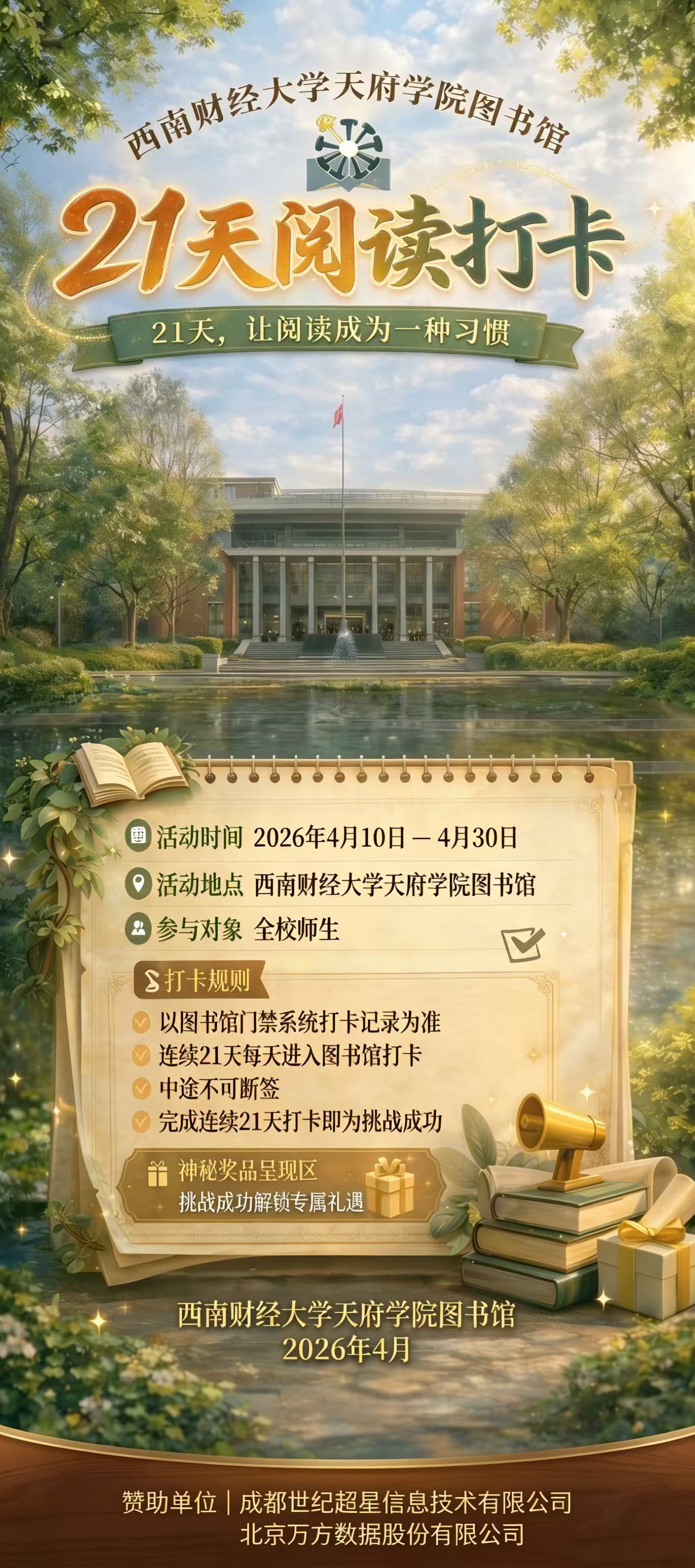 活动主旨:以第31届世界读书日为契机,21天连续到馆打卡为载体,倡导终身阅读、书香致远,涵养人文气质,建设文明、儒雅、好学的校园风尚。