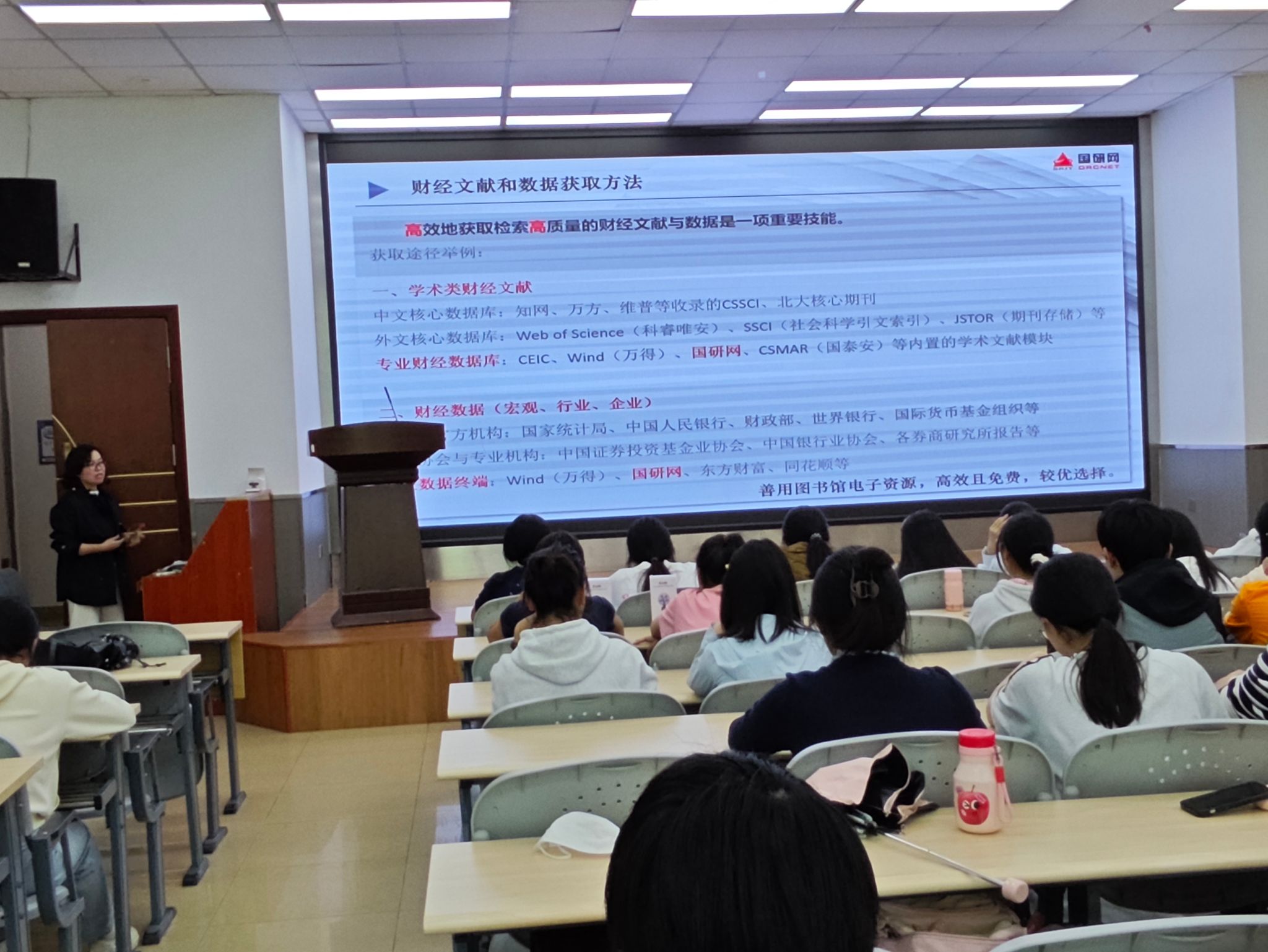 互动问答环节,主讲人就国研网数据库的主要内容、AI文献解析功能、统计数据系列、经济管理案例库构成等问题与现场师生进行了深入交流。学生们积极抢答,气氛活跃,不少同学表示“第一次直观感受到AI工具在财经科研中的强大助力”。